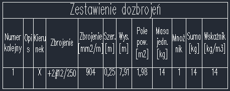 zbrojenia podstawowego. Fragment tabeli zestawienia: