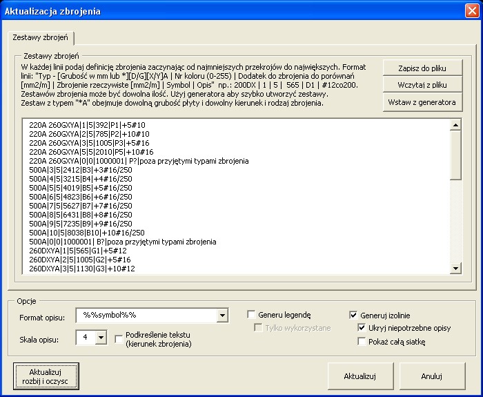 - aktualizuje mapę zbrojenia wg zadanych przedziałów zbrojenia. Okienko