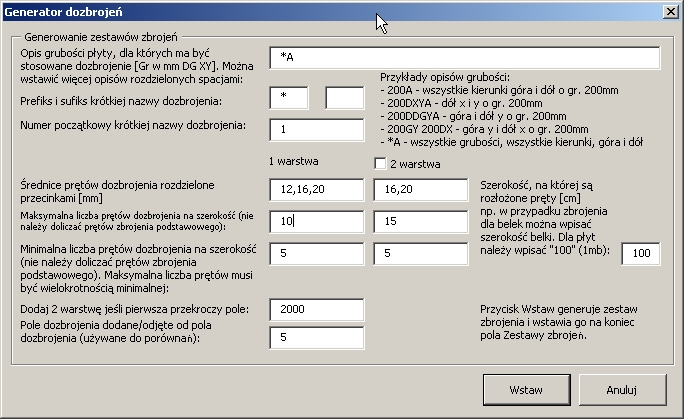 zakresów zbrojenia (np. dla belek, dla płyty górą,