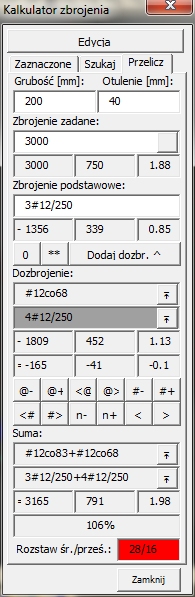 zbrojenia ponad siatkę podstawową w mm2/m, procent zbrojenia, grubość